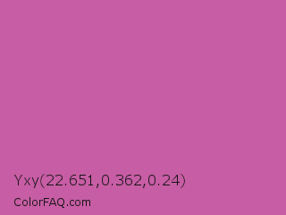 Yxy 22.651,0.362,0.24 Color is a normal magenta color and the nearest color is Super Pink #cf6ba9. Hex code #c75da4 and RGB value is rgb(199,93,164). In RGB color space, this color is composed of 78% red, 36% green, 64% blue, In CMYK color space, this color is composed of 0% cyan, 53% magenta, 18% yellow , 22% black , In HSL color space, this color has a hue angle of 320° , 49% saturation and 57% lightness.