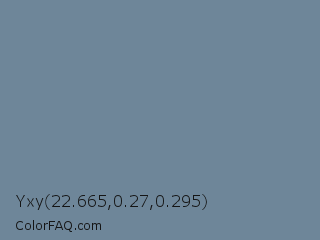 Yxy 22.665,0.27,0.295 Color is a normal blue color and the nearest color is Light Slate Gray #778899. Hex code #6e8699 and RGB value is rgb(110,134,153). In RGB color space, this color is composed of 43% red, 53% green, 60% blue, In CMYK color space, this color is composed of 28% cyan, 12% magenta, 0% yellow , 40% black , In HSL color space, this color has a hue angle of 207° , 17% saturation and 52% lightness.