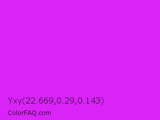 Yxy 22.669,0.29,0.143 Color is a normal magenta color and the nearest color is Phlox #df00ff. Hex code #d923f7 and RGB value is rgb(217,35,247). In RGB color space, this color is composed of 85% red, 14% green, 97% blue, In CMYK color space, this color is composed of 12% cyan, 86% magenta, 0% yellow , 3% black , In HSL color space, this color has a hue angle of 292° , 93% saturation and 55% lightness.