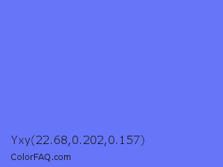 Yxy 22.68,0.202,0.157 Color is a light blue color and the nearest color is Very Light Blue #6666ff. Hex code #6776f9 and RGB value is rgb(103,118,249). In RGB color space, this color is composed of 40% red, 46% green, 98% blue, In CMYK color space, this color is composed of 59% cyan, 53% magenta, 0% yellow , 2% black , In HSL color space, this color has a hue angle of 234° , 92% saturation and 69% lightness.