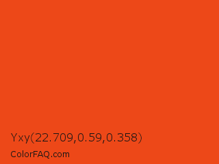 Yxy 22.709,0.59,0.358 Color is a normal red color and the nearest color is Pomegranate #f34723. Hex code #ed4818 and RGB value is rgb(237,72,24). In RGB color space, this color is composed of 93% red, 28% green, 9% blue, In CMYK color space, this color is composed of 0% cyan, 70% magenta, 90% yellow , 7% black , In HSL color space, this color has a hue angle of 14° , 86% saturation and 51% lightness.