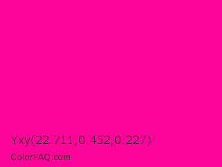 Yxy 22.711,0.452,0.227 Color is a normal magenta color and the nearest color is Hollywood Cerise #f400a1. Hex code #fa0499 and RGB value is rgb(250,4,153). In RGB color space, this color is composed of 98% red, 2% green, 60% blue, In CMYK color space, this color is composed of 0% cyan, 98% magenta, 39% yellow , 2% black , In HSL color space, this color has a hue angle of 324° , 97% saturation and 50% lightness.
