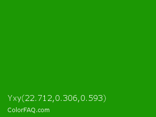 Yxy 22.712,0.306,0.593 Color is a normal green color and the nearest color is India Green #138808. Hex code #1c9804 and RGB value is rgb(28,152,4). In RGB color space, this color is composed of 11% red, 60% green, 2% blue, In CMYK color space, this color is composed of 82% cyan, 0% magenta, 97% yellow , 40% black , In HSL color space, this color has a hue angle of 110° , 95% saturation and 31% lightness.