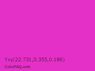 Yxy 22.731,0.355,0.186 Color is a normal magenta color and the nearest color is Steel Pink #cc33cc. Hex code #e430c7 and RGB value is rgb(228,48,199). In RGB color space, this color is composed of 89% red, 19% green, 78% blue, In CMYK color space, this color is composed of 0% cyan, 79% magenta, 13% yellow , 11% black , In HSL color space, this color has a hue angle of 310° , 77% saturation and 54% lightness.