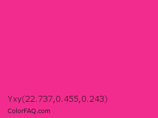 Yxy 22.737,0.455,0.243 Color is a normal rose color and the nearest color is Wild Strawberry Crayola #ff3399. Hex code #f22c8f and RGB value is rgb(242,44,143). In RGB color space, this color is composed of 95% red, 17% green, 56% blue, In CMYK color space, this color is composed of 0% cyan, 82% magenta, 41% yellow , 5% black , In HSL color space, this color has a hue angle of 330° , 88% saturation and 56% lightness.