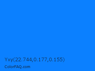 Yxy 22.744,0.177,0.155 Color is a normal blue color and the nearest color is Azure Radiance #007fff. Hex code #0b80ff and RGB value is rgb(11,128,255). In RGB color space, this color is composed of 4% red, 50% green, 100% blue, In CMYK color space, this color is composed of 96% cyan, 50% magenta, 0% yellow , 0% black , In HSL color space, this color has a hue angle of 211° , 100% saturation and 52% lightness.
