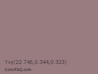 Yxy 22.746,0.344,0.323 Color is a normal red color and the nearest color is Cinereous #98817b. Hex code #997c80 and RGB value is rgb(153,124,128). In RGB color space, this color is composed of 60% red, 49% green, 50% blue, In CMYK color space, this color is composed of 0% cyan, 19% magenta, 16% yellow , 40% black , In HSL color space, this color has a hue angle of 352° , 12% saturation and 54% lightness.