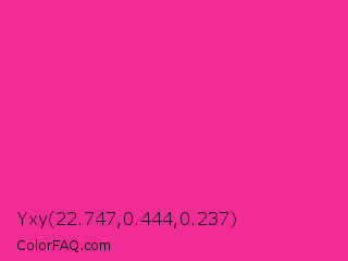 Yxy 22.747,0.444,0.237 Color is a normal rose color and the nearest color is Wild Strawberry Crayola #ff3399. Hex code #f12d95 and RGB value is rgb(241,45,149). In RGB color space, this color is composed of 95% red, 18% green, 58% blue, In CMYK color space, this color is composed of 0% cyan, 81% magenta, 38% yellow , 5% black , In HSL color space, this color has a hue angle of 328° , 88% saturation and 56% lightness.