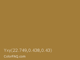 Yxy 22.749,0.438,0.43 Color is a normal orange color and the nearest color is Metallic Sunburst #9c7c38. Hex code #a37d39 and RGB value is rgb(163,125,57). In RGB color space, this color is composed of 64% red, 49% green, 22% blue, In CMYK color space, this color is composed of 0% cyan, 23% magenta, 65% yellow , 36% black , In HSL color space, this color has a hue angle of 38° , 48% saturation and 43% lightness.