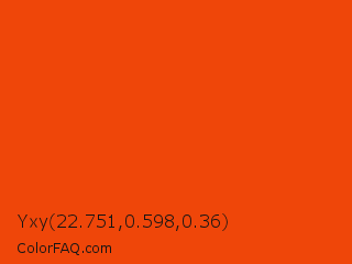Yxy 22.751,0.598,0.36 Color is a normal orange color and the nearest color is Trinidad #e64e03. Hex code #ef4609 and RGB value is rgb(239,70,9). In RGB color space, this color is composed of 94% red, 27% green, 4% blue, In CMYK color space, this color is composed of 0% cyan, 71% magenta, 96% yellow , 6% black , In HSL color space, this color has a hue angle of 16° , 93% saturation and 49% lightness.