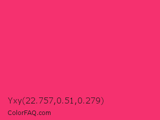 Yxy 22.757,0.51,0.279 Color is a normal rose color and the nearest color is Radical Red #ff355e. Hex code #f5316f and RGB value is rgb(245,49,111). In RGB color space, this color is composed of 96% red, 19% green, 44% blue, In CMYK color space, this color is composed of 0% cyan, 80% magenta, 55% yellow , 4% black , In HSL color space, this color has a hue angle of 341° , 91% saturation and 58% lightness.