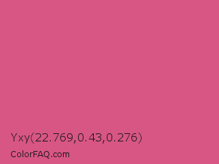 Yxy 22.769,0.43,0.276 Color is a normal rose color and the nearest color is Mystic #d65282. Hex code #d75684 and RGB value is rgb(215,86,132). In RGB color space, this color is composed of 84% red, 34% green, 52% blue, In CMYK color space, this color is composed of 0% cyan, 60% magenta, 39% yellow , 16% black , In HSL color space, this color has a hue angle of 339° , 62% saturation and 59% lightness.