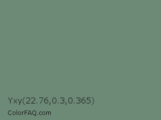 Yxy 22.76,0.3,0.365 Color is a normal green color and the nearest color is Viridian Green #678975. Hex code #6d8a77 and RGB value is rgb(109,138,119). In RGB color space, this color is composed of 43% red, 54% green, 47% blue, In CMYK color space, this color is composed of 21% cyan, 0% magenta, 14% yellow , 46% black , In HSL color space, this color has a hue angle of 141° , 12% saturation and 48% lightness.