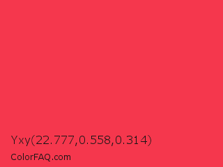 Yxy 22.777,0.558,0.314 Color is a normal red color and the nearest color is Red Salsa #fd3a4a. Hex code #f5374d and RGB value is rgb(245,55,77). In RGB color space, this color is composed of 96% red, 22% green, 30% blue, In CMYK color space, this color is composed of 0% cyan, 78% magenta, 69% yellow , 4% black , In HSL color space, this color has a hue angle of 353° , 90% saturation and 59% lightness.