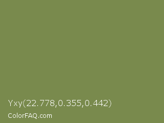 Yxy 22.778,0.355,0.442 Color is a normal lime color and the nearest color is Palm Leaf #6f9940. Hex code #798a4d and RGB value is rgb(121,138,77). In RGB color space, this color is composed of 47% red, 54% green, 30% blue, In CMYK color space, this color is composed of 12% cyan, 0% magenta, 44% yellow , 46% black , In HSL color space, this color has a hue angle of 77° , 28% saturation and 42% lightness.