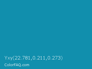 Yxy 22.781,0.211,0.273 Color is a normal cyan color and the nearest color is Blue Green #0d98ba. Hex code #118fad and RGB value is rgb(17,143,173). In RGB color space, this color is composed of 7% red, 56% green, 68% blue, In CMYK color space, this color is composed of 90% cyan, 17% magenta, 0% yellow , 32% black , In HSL color space, this color has a hue angle of 192° , 82% saturation and 37% lightness.