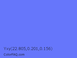 Yxy 22.805,0.201,0.156 Color is a light blue color and the nearest color is Very Light Blue #6666ff. Hex code #6676fb and RGB value is rgb(102,118,251). In RGB color space, this color is composed of 40% red, 46% green, 98% blue, In CMYK color space, this color is composed of 59% cyan, 53% magenta, 0% yellow , 2% black , In HSL color space, this color has a hue angle of 234° , 95% saturation and 69% lightness.