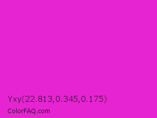Yxy 22.813,0.345,0.175 Color is a normal magenta color and the nearest color is Hot Magenta #ff1dce. Hex code #e624d1 and RGB value is rgb(230,36,209). In RGB color space, this color is composed of 90% red, 14% green, 82% blue, In CMYK color space, this color is composed of 0% cyan, 84% magenta, 9% yellow , 10% black , In HSL color space, this color has a hue angle of 306° , 80% saturation and 52% lightness.