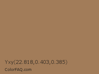 Yxy 22.818,0.403,0.385 Color is a normal orange color and the nearest color is French Beige #a67b5b. Hex code #a27c59 and RGB value is rgb(162,124,89). In RGB color space, this color is composed of 64% red, 49% green, 35% blue, In CMYK color space, this color is composed of 0% cyan, 23% magenta, 45% yellow , 36% black , In HSL color space, this color has a hue angle of 29° , 29% saturation and 49% lightness.