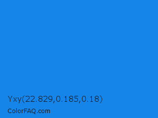Yxy 22.829,0.185,0.18 Color is a normal blue color and the nearest color is Dodger Blue #1e90ff. Hex code #1685e9 and RGB value is rgb(22,133,233). In RGB color space, this color is composed of 9% red, 52% green, 91% blue, In CMYK color space, this color is composed of 91% cyan, 43% magenta, 0% yellow , 9% black , In HSL color space, this color has a hue angle of 208° , 83% saturation and 50% lightness.