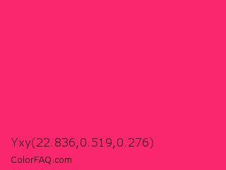 Yxy 22.836,0.519,0.276 Color is a normal rose color and the nearest color is Radical Red #ff355e. Hex code #fa266e and RGB value is rgb(250,38,110). In RGB color space, this color is composed of 98% red, 15% green, 43% blue, In CMYK color space, this color is composed of 0% cyan, 85% magenta, 56% yellow , 2% black , In HSL color space, this color has a hue angle of 340° , 95% saturation and 56% lightness.