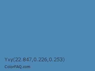 Yxy 22.847,0.226,0.253 Color is a normal blue color and the nearest color is Cyan Azure #4e82b4. Hex code #4e89b5 and RGB value is rgb(78,137,181). In RGB color space, this color is composed of 31% red, 54% green, 71% blue, In CMYK color space, this color is composed of 57% cyan, 24% magenta, 0% yellow , 29% black , In HSL color space, this color has a hue angle of 206° , 41% saturation and 51% lightness.