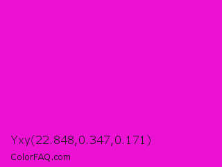 Yxy 22.848,0.347,0.171 Color is a normal magenta color and the nearest color is Hot Magenta #ff1dce. Hex code #eb12d4 and RGB value is rgb(235,18,212). In RGB color space, this color is composed of 92% red, 7% green, 83% blue, In CMYK color space, this color is composed of 0% cyan, 92% magenta, 10% yellow , 8% black , In HSL color space, this color has a hue angle of 306° , 86% saturation and 50% lightness.