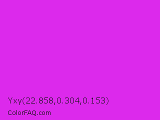 Yxy 22.858,0.304,0.153 Color is a normal magenta color and the nearest color is Steel Pink #cc33cc. Hex code #dc29ec and RGB value is rgb(220,41,236). In RGB color space, this color is composed of 86% red, 16% green, 93% blue, In CMYK color space, this color is composed of 7% cyan, 83% magenta, 0% yellow , 7% black , In HSL color space, this color has a hue angle of 295° , 84% saturation and 54% lightness.