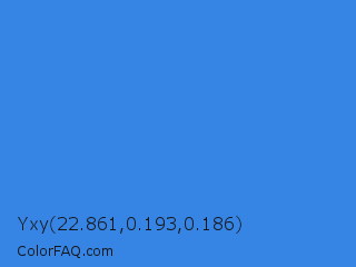 Yxy 22.861,0.193,0.186 Color is a normal blue color and the nearest color is Bleu De France #318ce7. Hex code #3684e4 and RGB value is rgb(54,132,228). In RGB color space, this color is composed of 21% red, 52% green, 89% blue, In CMYK color space, this color is composed of 76% cyan, 42% magenta, 0% yellow , 11% black , In HSL color space, this color has a hue angle of 213° , 76% saturation and 55% lightness.