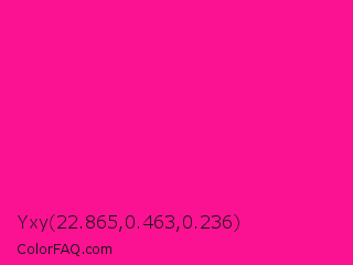 Yxy 22.865,0.463,0.236 Color is a normal magenta color and the nearest color is Fluorescent Pink #ff1493. Hex code #fa1292 and RGB value is rgb(250,18,146). In RGB color space, this color is composed of 98% red, 7% green, 57% blue, In CMYK color space, this color is composed of 0% cyan, 93% magenta, 42% yellow , 2% black , In HSL color space, this color has a hue angle of 327° , 96% saturation and 53% lightness.