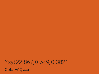 Yxy 22.867,0.549,0.382 Color is a normal orange color and the nearest color is Vivid Red Tangelo #df6124. Hex code #d95e21 and RGB value is rgb(217,94,33). In RGB color space, this color is composed of 85% red, 37% green, 13% blue, In CMYK color space, this color is composed of 0% cyan, 57% magenta, 85% yellow , 15% black , In HSL color space, this color has a hue angle of 20° , 74% saturation and 49% lightness.