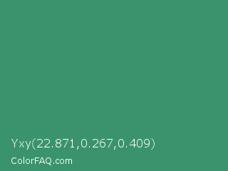 Yxy 22.871,0.267,0.409 Color is a normal green color and the nearest color is Illuminating Emerald #319177. Hex code #3a936d and RGB value is rgb(58,147,109). In RGB color space, this color is composed of 23% red, 58% green, 43% blue, In CMYK color space, this color is composed of 61% cyan, 0% magenta, 26% yellow , 42% black , In HSL color space, this color has a hue angle of 154° , 43% saturation and 40% lightness.