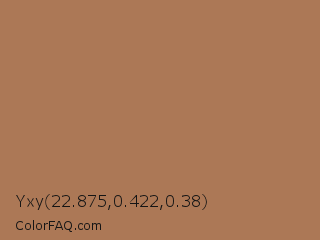 Yxy 22.875,0.422,0.38 Color is a normal orange color and the nearest color is French Beige #a67b5b. Hex code #ac7856 and RGB value is rgb(172,120,86). In RGB color space, this color is composed of 67% red, 47% green, 34% blue, In CMYK color space, this color is composed of 0% cyan, 30% magenta, 50% yellow , 33% black , In HSL color space, this color has a hue angle of 24° , 34% saturation and 51% lightness.
