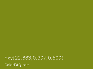 Yxy 22.883,0.397,0.509 Color is a normal yellow color and the nearest color is Trendy Green #7c881a. Hex code #7d8b16 and RGB value is rgb(125,139,22). In RGB color space, this color is composed of 49% red, 55% green, 9% blue, In CMYK color space, this color is composed of 10% cyan, 0% magenta, 84% yellow , 45% black , In HSL color space, this color has a hue angle of 67° , 73% saturation and 32% lightness.