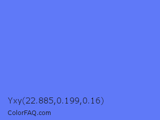 Yxy 22.885,0.199,0.16 Color is a light blue color and the nearest color is Blueberry #4f86f7. Hex code #5f79f8 and RGB value is rgb(95,121,248). In RGB color space, this color is composed of 37% red, 47% green, 97% blue, In CMYK color space, this color is composed of 62% cyan, 51% magenta, 0% yellow , 3% black , In HSL color space, this color has a hue angle of 230° , 92% saturation and 67% lightness.