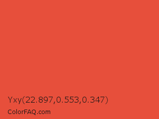 Yxy 22.897,0.553,0.347 Color is a normal red color and the nearest color is Carmine Pink #eb4c42. Hex code #e74f3b and RGB value is rgb(231,79,59). In RGB color space, this color is composed of 91% red, 31% green, 23% blue, In CMYK color space, this color is composed of 0% cyan, 66% magenta, 74% yellow , 9% black , In HSL color space, this color has a hue angle of 7° , 78% saturation and 57% lightness.
