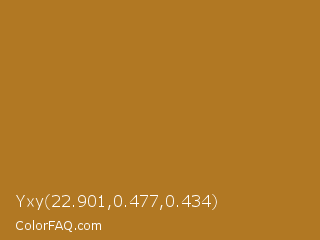 Yxy 22.901,0.477,0.434 Color is a normal orange color and the nearest color is Mandalay #ad781b. Hex code #b17823 and RGB value is rgb(177,120,35). In RGB color space, this color is composed of 69% red, 47% green, 14% blue, In CMYK color space, this color is composed of 0% cyan, 32% magenta, 80% yellow , 31% black , In HSL color space, this color has a hue angle of 36° , 67% saturation and 42% lightness.