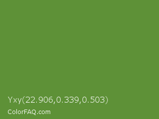 Yxy 22.906,0.339,0.503 Color is a normal green color and the nearest color is Maximum Green #5e8c31. Hex code #5e9137 and RGB value is rgb(94,145,55). In RGB color space, this color is composed of 37% red, 57% green, 22% blue, In CMYK color space, this color is composed of 35% cyan, 0% magenta, 62% yellow , 43% black , In HSL color space, this color has a hue angle of 94° , 45% saturation and 39% lightness.