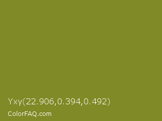 Yxy 22.906,0.394,0.492 Color is a normal yellow color and the nearest color is Wasabi #788a25. Hex code #808a26 and RGB value is rgb(128,138,38). In RGB color space, this color is composed of 50% red, 54% green, 15% blue, In CMYK color space, this color is composed of 7% cyan, 0% magenta, 72% yellow , 46% black , In HSL color space, this color has a hue angle of 66° , 57% saturation and 35% lightness.