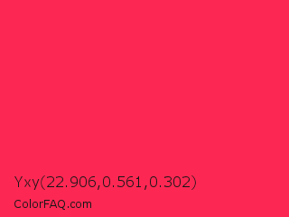 Yxy 22.906,0.561,0.302 Color is a normal red color and the nearest color is Awesome #ff2052. Hex code #fc2853 and RGB value is rgb(252,40,83). In RGB color space, this color is composed of 99% red, 16% green, 33% blue, In CMYK color space, this color is composed of 0% cyan, 84% magenta, 67% yellow , 1% black , In HSL color space, this color has a hue angle of 348° , 97% saturation and 57% lightness.
