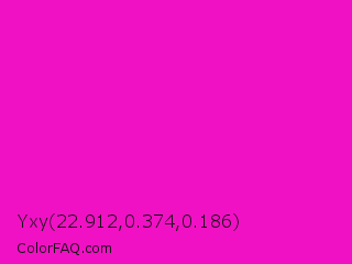 Yxy 22.912,0.374,0.186 Color is a normal magenta color and the nearest color is Shocking Pink #fc0fc0. Hex code #f011c4 and RGB value is rgb(240,17,196). In RGB color space, this color is composed of 94% red, 7% green, 77% blue, In CMYK color space, this color is composed of 0% cyan, 93% magenta, 18% yellow , 6% black , In HSL color space, this color has a hue angle of 312° , 88% saturation and 50% lightness.