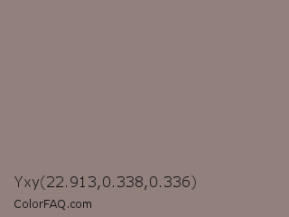 Yxy 22.913,0.338,0.336 Color is a normal red color and the nearest color is Squirrel #8f8176. Hex code #91807c and RGB value is rgb(145,128,124). In RGB color space, this color is composed of 57% red, 50% green, 49% blue, In CMYK color space, this color is composed of 0% cyan, 12% magenta, 14% yellow , 43% black , In HSL color space, this color has a hue angle of 11° , 9% saturation and 53% lightness.