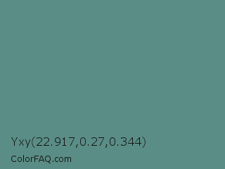 Yxy 22.917,0.27,0.344 Color is a normal cyan color and the nearest color is Steel Teal #5f8a8b. Hex code #5a8d85 and RGB value is rgb(90,141,133). In RGB color space, this color is composed of 35% red, 55% green, 52% blue, In CMYK color space, this color is composed of 36% cyan, 0% magenta, 6% yellow , 45% black , In HSL color space, this color has a hue angle of 171° , 22% saturation and 45% lightness.