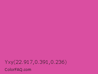 Yxy 22.917,0.391,0.236 Color is a normal magenta color and the nearest color is Raspberry Pink #e25098. Hex code #da4ea1 and RGB value is rgb(218,78,161). In RGB color space, this color is composed of 85% red, 31% green, 63% blue, In CMYK color space, this color is composed of 0% cyan, 64% magenta, 26% yellow , 15% black , In HSL color space, this color has a hue angle of 324° , 65% saturation and 58% lightness.