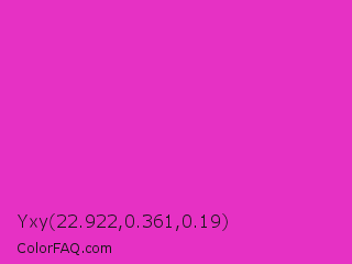 Yxy 22.922,0.361,0.19 Color is a normal magenta color and the nearest color is Razzle Dazzle Rose #ff33cc. Hex code #e631c4 and RGB value is rgb(230,49,196). In RGB color space, this color is composed of 90% red, 19% green, 77% blue, In CMYK color space, this color is composed of 0% cyan, 79% magenta, 15% yellow , 10% black , In HSL color space, this color has a hue angle of 311° , 78% saturation and 55% lightness.
