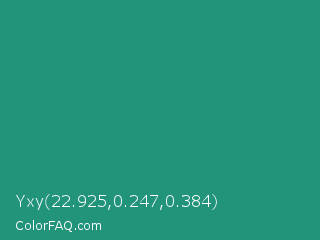 Yxy 22.925,0.247,0.384 Color is a normal cyan color and the nearest color is Illuminating Emerald #319177. Hex code #22947a and RGB value is rgb(34,148,122). In RGB color space, this color is composed of 13% red, 58% green, 48% blue, In CMYK color space, this color is composed of 77% cyan, 0% magenta, 18% yellow , 42% black , In HSL color space, this color has a hue angle of 166° , 63% saturation and 36% lightness.