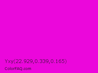 Yxy 22.929,0.339,0.165 Color is a normal magenta color and the nearest color is Purple Pizzazz #ff00cc. Hex code #eb07db and RGB value is rgb(235,7,219). In RGB color space, this color is composed of 92% red, 3% green, 86% blue, In CMYK color space, this color is composed of 0% cyan, 97% magenta, 7% yellow , 8% black , In HSL color space, this color has a hue angle of 304° , 94% saturation and 47% lightness.