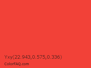 Yxy 22.943,0.575,0.336 Color is a normal red color and the nearest color is Red Orange #ff3f34. Hex code #f24138 and RGB value is rgb(242,65,56). In RGB color space, this color is composed of 95% red, 25% green, 22% blue, In CMYK color space, this color is composed of 0% cyan, 73% magenta, 77% yellow , 5% black , In HSL color space, this color has a hue angle of 3° , 88% saturation and 58% lightness.