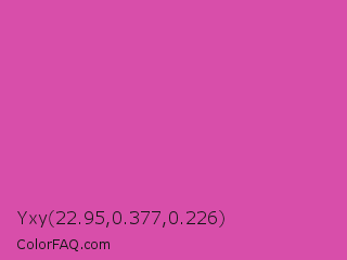 Yxy 22.95,0.377,0.226 Color is a normal magenta color and the nearest color is Raspberry Pink #e25098. Hex code #d84eaa and RGB value is rgb(216,78,170). In RGB color space, this color is composed of 85% red, 31% green, 67% blue, In CMYK color space, this color is composed of 0% cyan, 64% magenta, 21% yellow , 15% black , In HSL color space, this color has a hue angle of 320° , 64% saturation and 58% lightness.