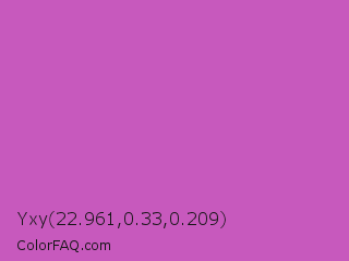 Yxy 22.961,0.33,0.209 Color is a normal magenta color and the nearest color is Fuchsia Pink #c154c1. Hex code #c759bd and RGB value is rgb(199,89,189). In RGB color space, this color is composed of 78% red, 35% green, 74% blue, In CMYK color space, this color is composed of 0% cyan, 55% magenta, 5% yellow , 22% black , In HSL color space, this color has a hue angle of 305° , 50% saturation and 56% lightness.